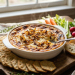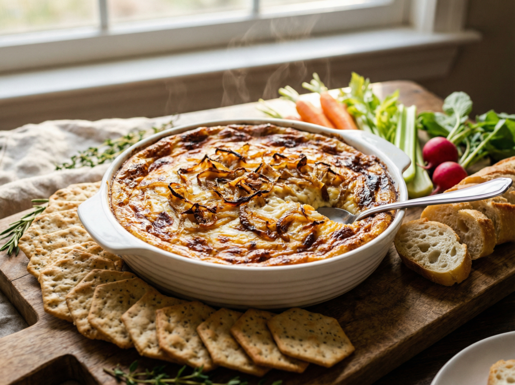 This baked onion dip is incredibly versatile. It pairs wonderfully with a variety of dippers such as sturdy crackers, toasted baguette slices, pita chips, pretzel crisps, or fresh vegetable sticks like carrots, celery, and bell peppers. For a heartier option, serve it alongside grilled chicken or steak.